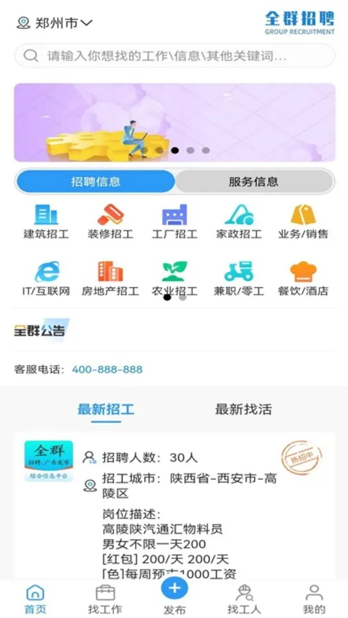 以招聘信息为主同时包含服务信息的综合信息平台。实时最新的用工信息,海量的货运、生活服务、广告发布和查询,主要分为“招聘信息”和“服务信息”两大版块。招聘、求职、找工作、货运信息、二手市场、广告发布等生活服务,覆盖全国所有城市,汇聚大量个人和商家需求信息。不用等待招聘会,没有中介;真实、高效的直接与老板和用人单位联系沟通。