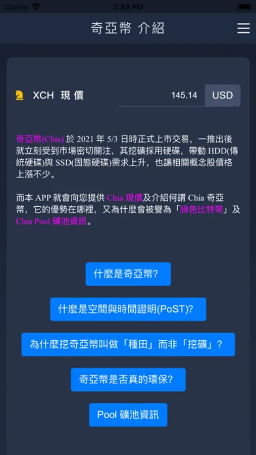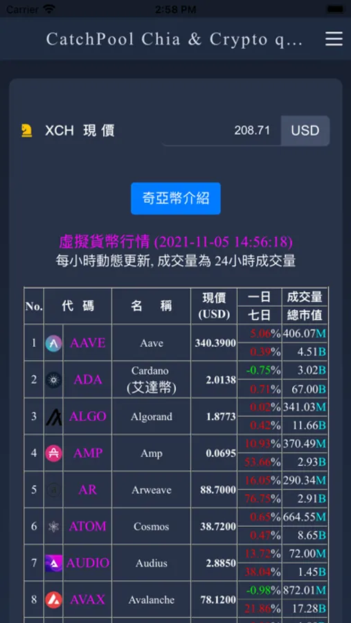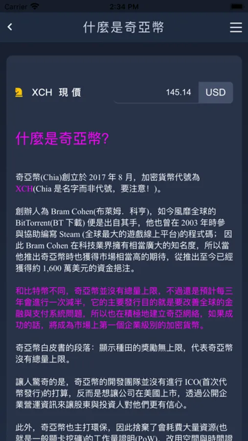 提供 100種虛擬貨幣行情 及 奇亞幣介紹 (什麼是奇亞幣/空間與時間證明(PoST)/「種田」而非「挖礦」/奇亞幣是否真的環保/Pool 礦池資訊)