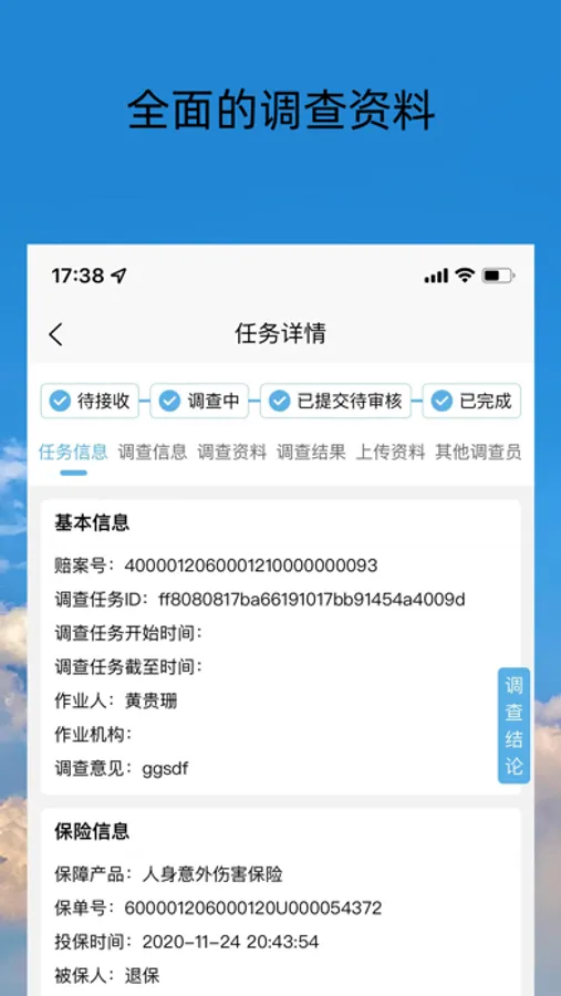 天信意健险作业端是宝莲灯旗下以保险为核心的综合公估调查服务平台,目前以意健险为主要业务,致力于为客户提供个性化、系统化的综合服务方案。