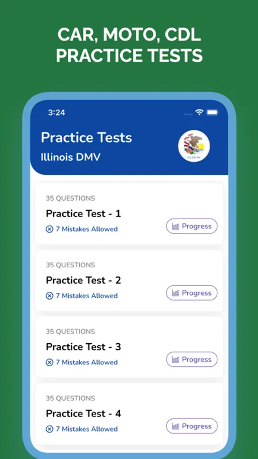 Are you applying for the Illinois DMV permit driver’s license test certification? Use this application to study for, improve your score on, and ultimately pass both the CDL driver's licence test and the DMV driver's licence test for the state of Illinois in order to obtain your permit on the very first attempt.