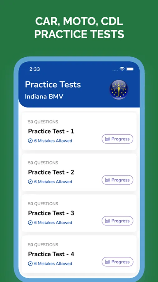 Are you applying for the Indiana DMV permit driver’s license test certification? Use this application to study for, improve your score on, and ultimately pass both the CDL driver's licence test and the DMV driver's licence test for the state of Indiana in order to obtain your permit on the very first attempt.