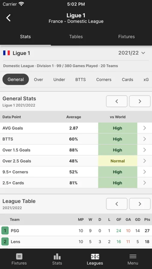 FootyStats covers over 1,500 major & minor soccer leagues and cups - ranging from England's Premier League to Latvia’s 1st league. By calculating and generating our own data for Over/Under, BTTS, and Clean Sheets stats, we guarantee that our soccer stats are accurate and up-to-date.