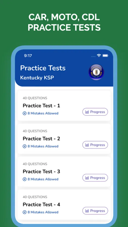 Are you applying for the Kentucky KSP permit driver’s license test certification? Use this application to study for, improve your score on, and ultimately pass both the CDL driver's licence test and the DMV driver's licence test for the state of Kentucky in order to obtain your permit on the very first attempt.