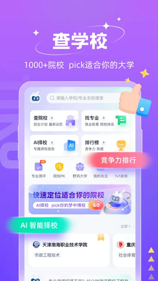 ▪AI智能择校、院校竞争力/热度排行榜、院校PK,帮你快速选择适合你的院校。