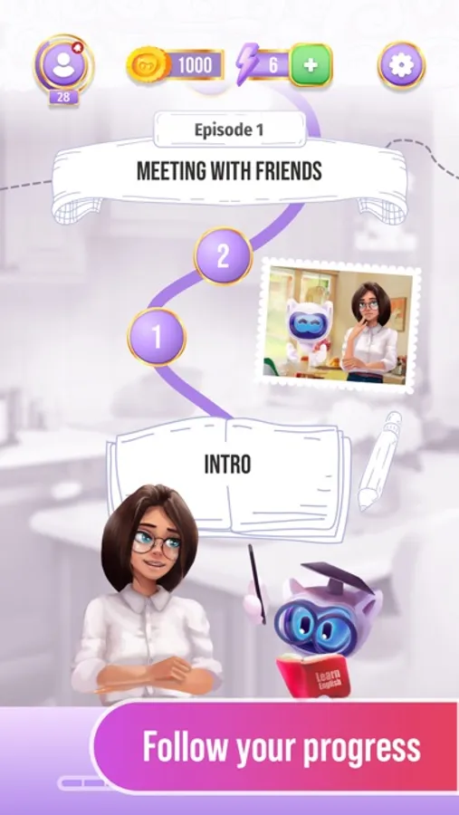 > A story behind it all. There are many mysteries in the history of Langly: who created him? why is he losing his memory? who wants to take him away? Julia Summers have to find answers to all these questions in order to learn English and go to the USA. The learning process is based on storytelling. Follow the mysterious journey of the main characters in the USA and around the world and help them solve all the secrets on their way.