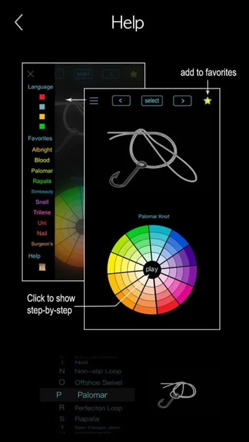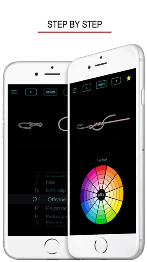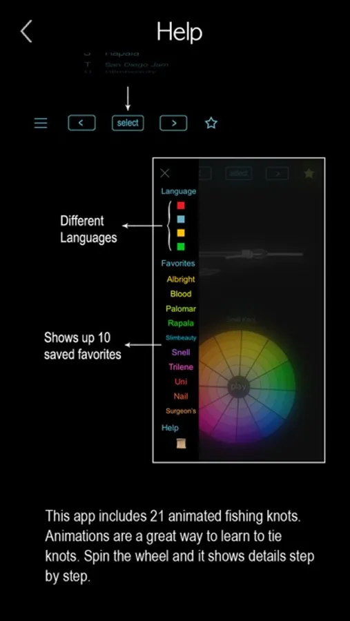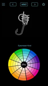 This app includes 21 animated fishing knots. Animations are a great way to learn to tie knots. Spin the wheel and it shows details step by step.