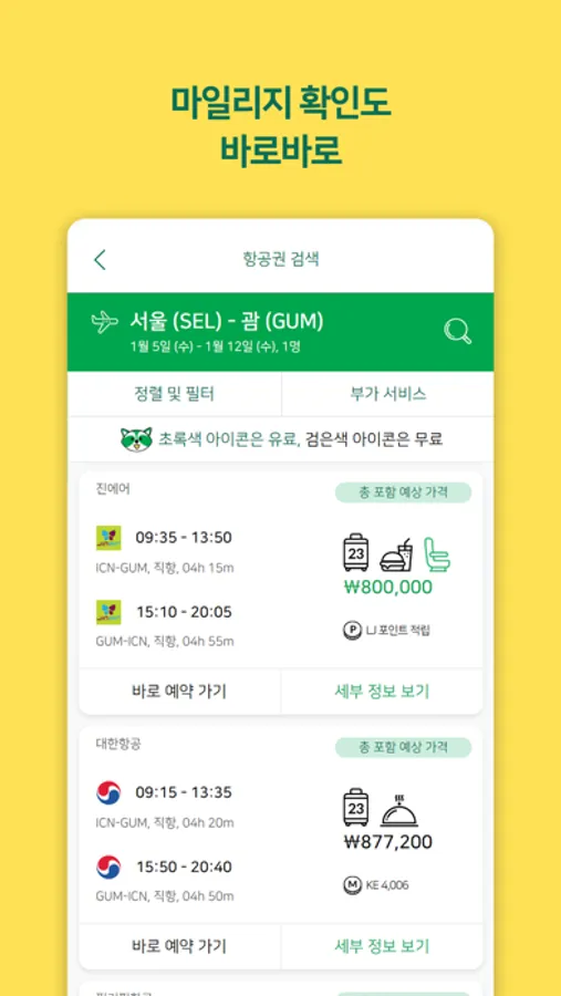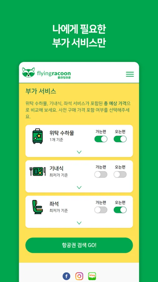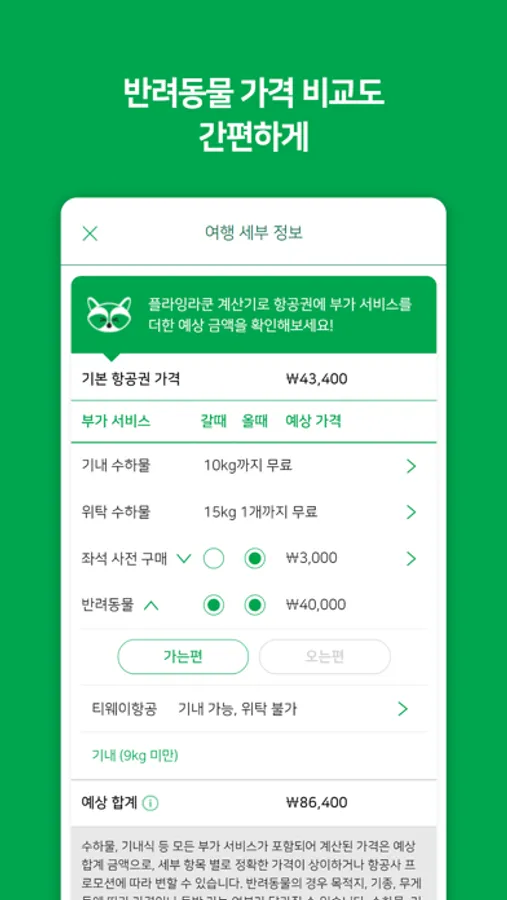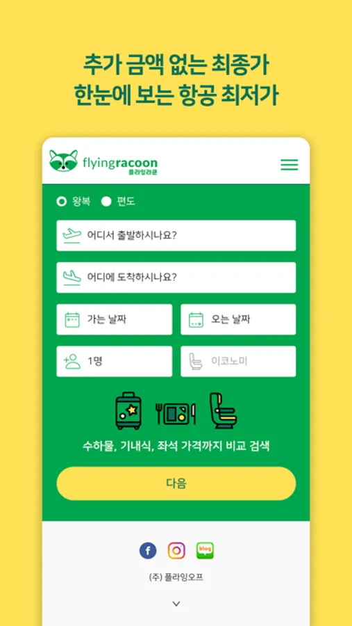 위탁/추가 수하물, 기내식, 사전 좌석, 반려동물 수속, 모든 항공권의 최종 금액을 최저 금액으로 비교해 주는 똑똑한 플라잉라쿤 지금 다운로드 받아 보세요!