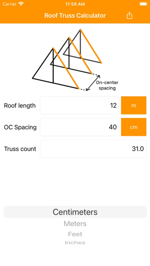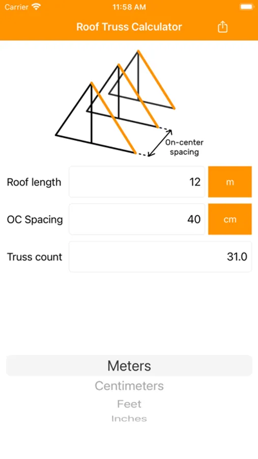 Roof Truss Calculator can also quickly determine Truss Count based on Roof length and On Center Spacing expressed in: