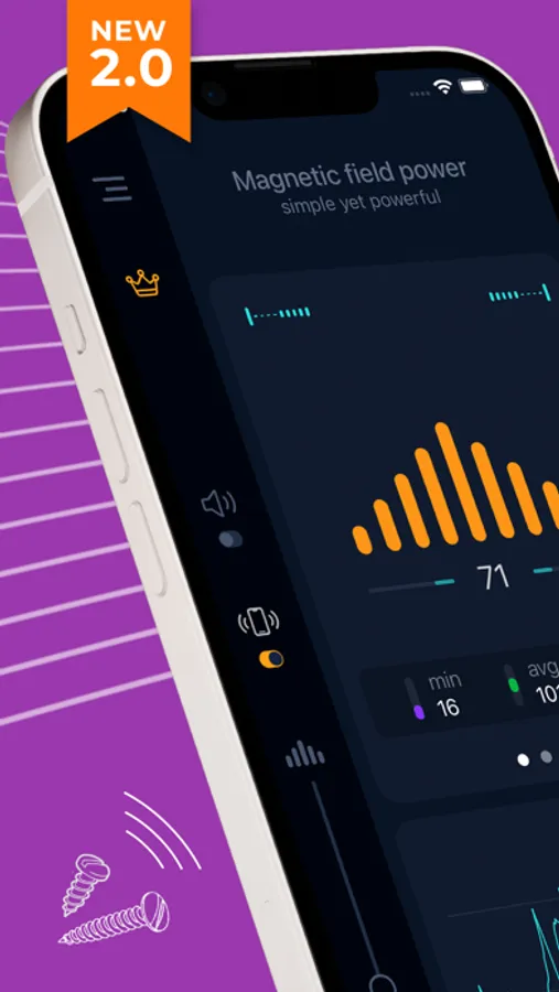 Intuitive visual, audio, and tactile indicators will notify you when a ferrous object is detected. In addition, the app displays the absolute value of the magnetic field in microtesla (µT), the dynamics of change, and the history of measurement for solving more complex problems.