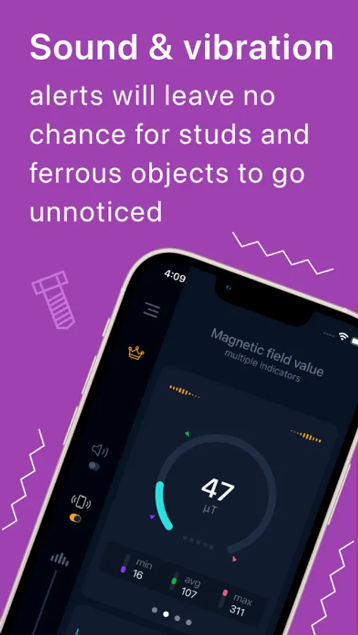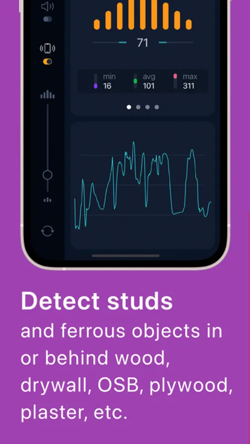 This app will help you find ferrous metal objects such as studs, screws, and nails hidden in or behind wood, drywall, OSB, plywood, plaster, etc.