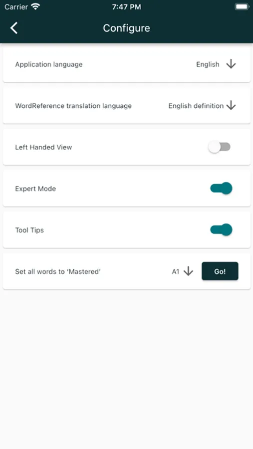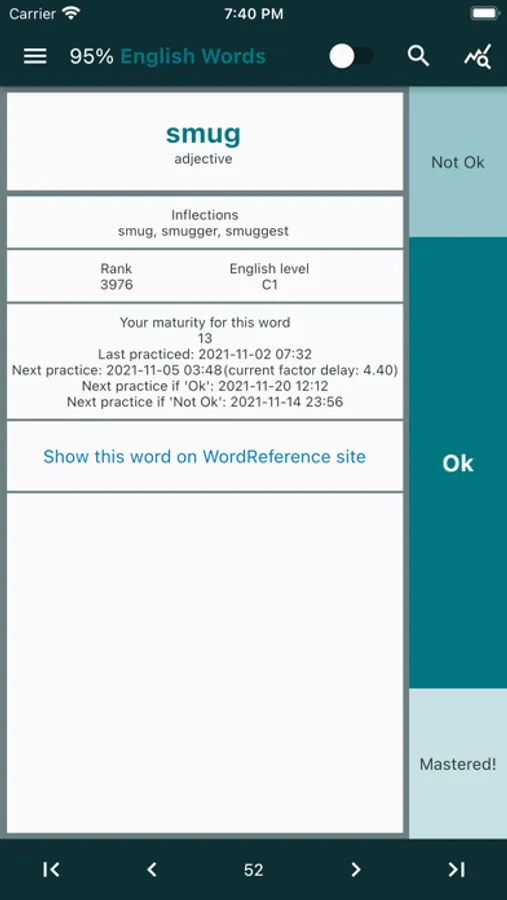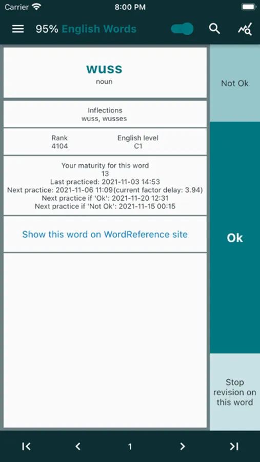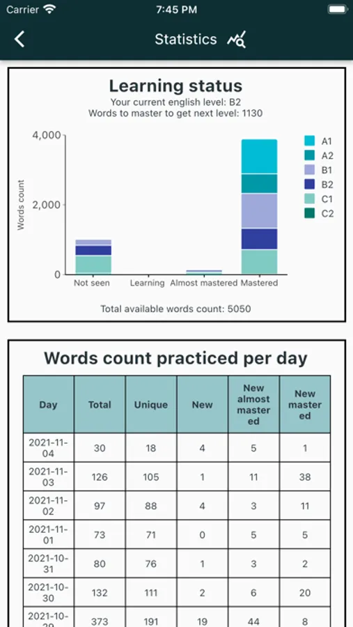 Follow your progress with the statistics screen, search for a word according to different criteria (practice history, level, ...), activate review mode and review the words that you have the most difficulty memorizing, ...