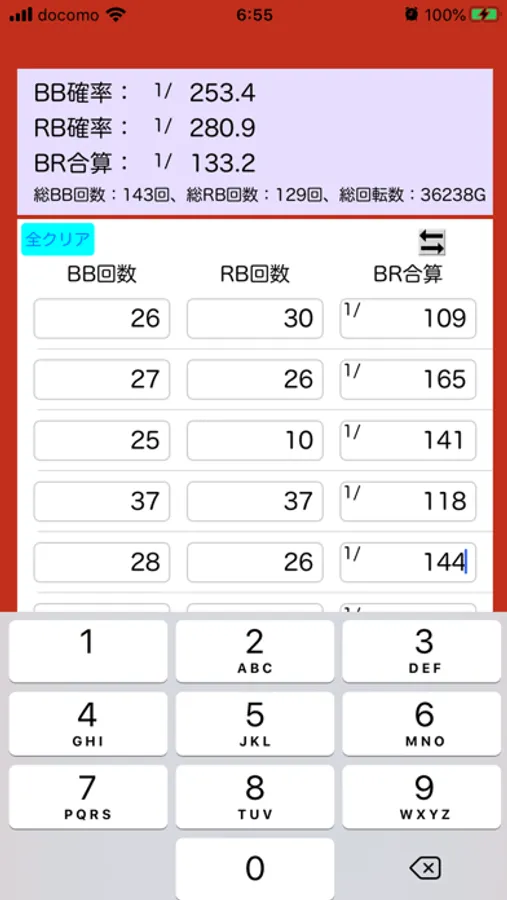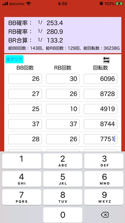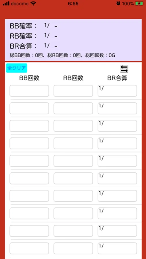 「全六計算機」は全台の平均BIG確率、平均REG確率を簡単に計算できる計算機アプリです。