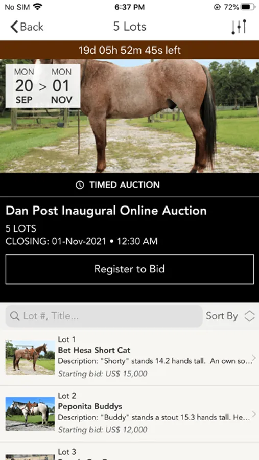 Offering top quality horses in an online auction. With the Dan Post Quarter Horse Auction app, you can preview, watch and bid in our auctions from your mobile / tablet device. Participate in our sales while on-the-go and gain access to our following features: *Quick Registration *Following upcoming lots of interest *Push notifications to ensure you engage on items of interest *Track bidding history and activity *Watch live auctions
