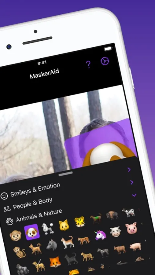 When you load an image with MaskerAid, it will AUTOMATICALLY detect all the faces in that photo, and obscure them with an emoji. Using MaskerAid, it's quick and easy to obscure the faces of children, shy friends, coworkers, or randos that are in your photos.