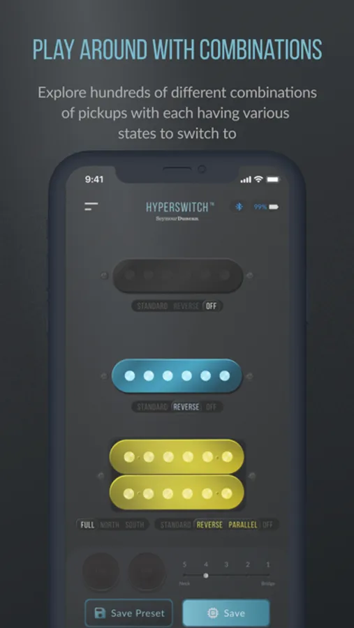 Imagine instant access to a wide range of iconic tones with a flip of your pickup switch. HyperSwitch is a groundbreaking digital 5-way guitar pickup switch with an all-analog signal that allows you to unlock exciting new tones from your existing pickups. Once installed, effortlessly tweak each switch position with the touch of the HyperSwitch app to create unique pickup combinations and wiring options — it’s like having a personal guitar tech on your phone. Anything is possible — combine a single coil neck pickup with one half of a bridge humbucker, coil split any humbucker, or even swap the phase of any coil. Create up to 5 unique pickup combinations for each preset you save on the Hyperswitch, and save over 100 presets in the app.
