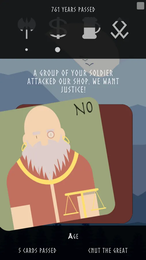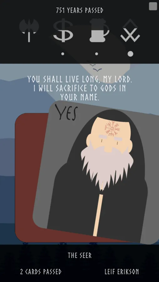 Each card you swipe brings you a random request or event which will require you to balance the relationship between the people, the army, the seer, and the treasury. You will need careful planning to make a long reign, but unpredictable consequences and poor luck may bring you to an end. Extend your time on the throne as long as possible, balance the relationships and find new ways to die as you go further between years.