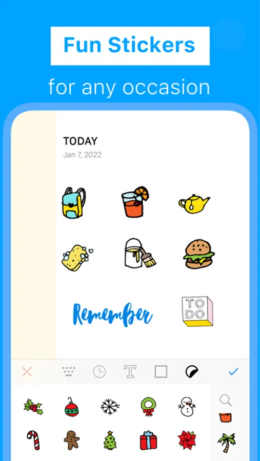 - Plan your day with fun hand drawn stickers - Add quotes stickers to highlight and inspire your days- Highlight your day with beautiful fonts- Build todo list beyond checklist or bullet point with borders and custom points- Track important moment like menstrual and period cycle with notes and stickers