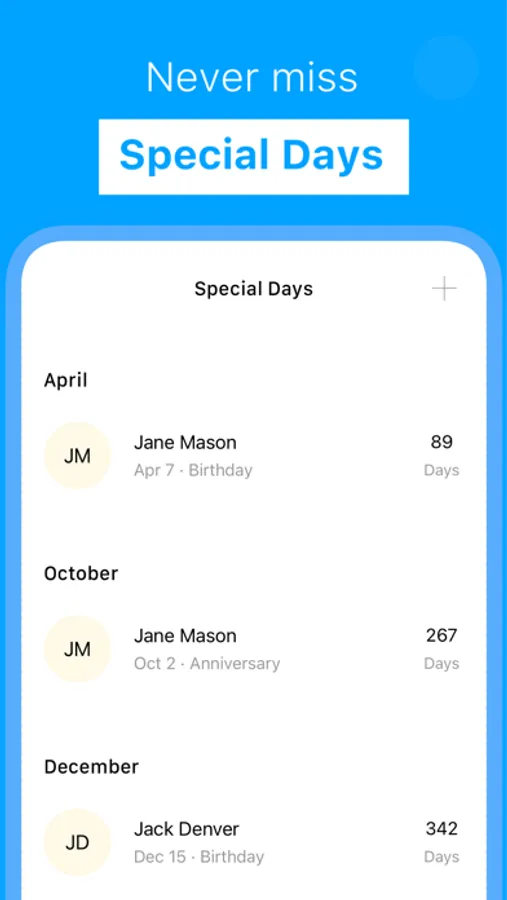 ◉ NEVER FORGET IMPORTANT EVENTSUse Calist as your life organizer for important events. Add calendar events as reminders for anniversaries and birthdays, and plan ahead to make them epic. Also include notes with gift ideas for each special event. The most important people in your life deserve the very best!