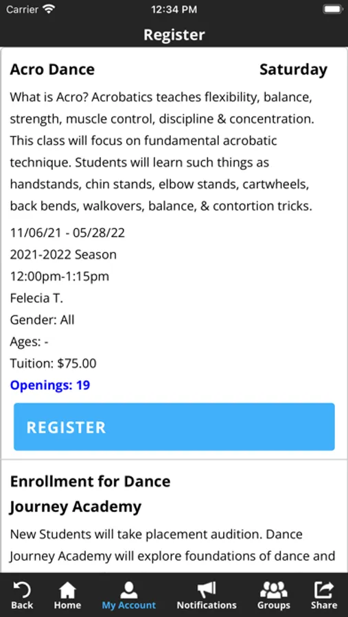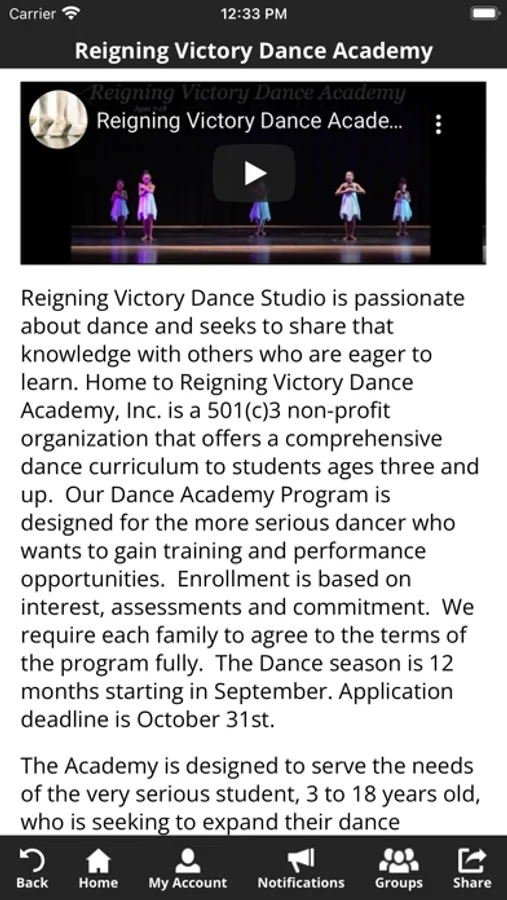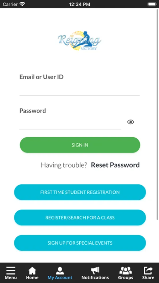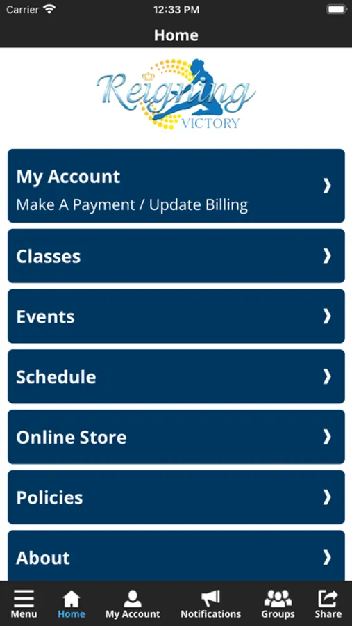 The Reigning Victory app allows you to manage your account with ease, register for classes, workshops, and special events. You'll also receive important notifications about class changes, closings, registration openings, special announcements, and upcoming events.