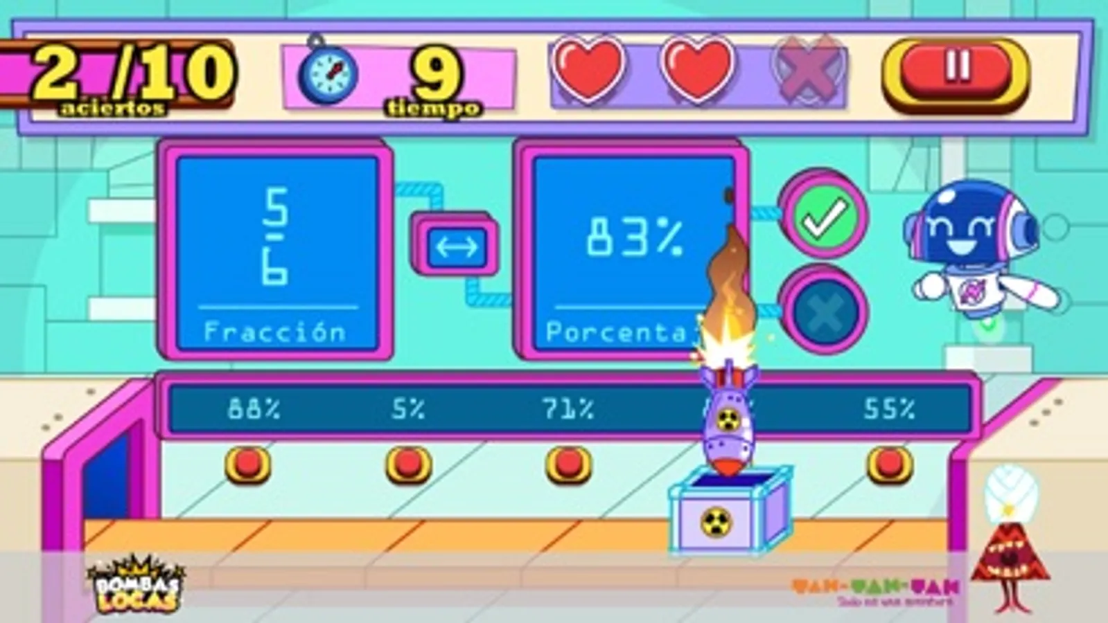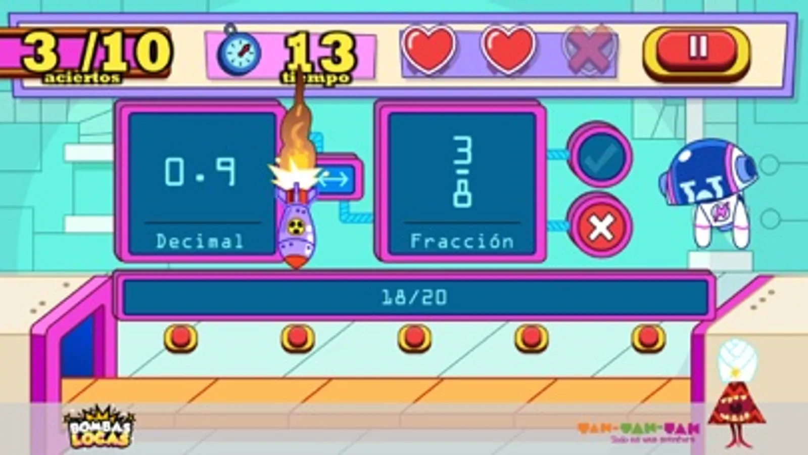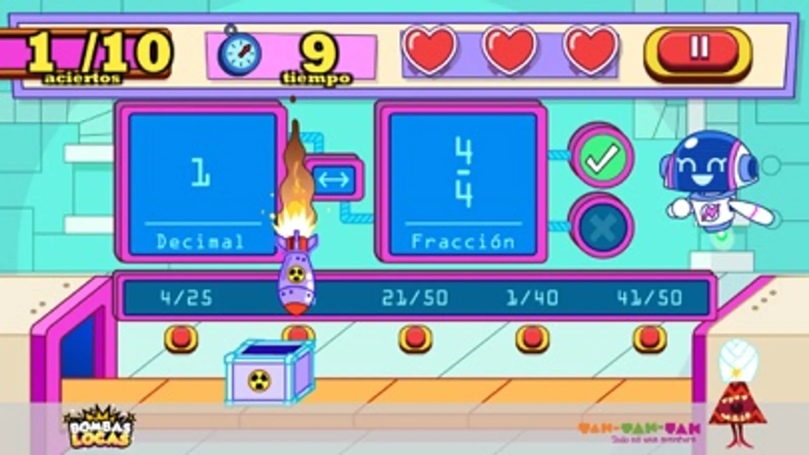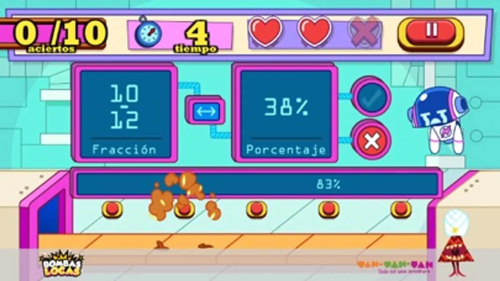 This educational video game of Science, studies the concept of mathematical equivalences with fractions, percentages and decimals. Help girls and boys to practice the concepts of fraction and its equivalences as well as its representation as decimal and percentage.