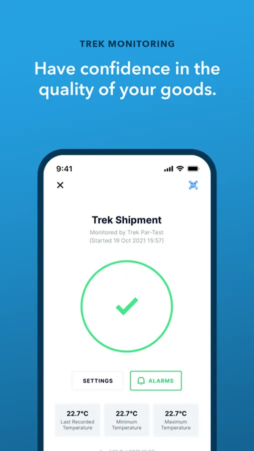 The Parsyl iOS app provides users with the ability to transfer and view data from a Parsyl Trek sensing device by simply scanning the Parsyl QR code on the shipment box or device.