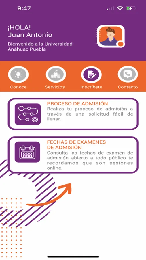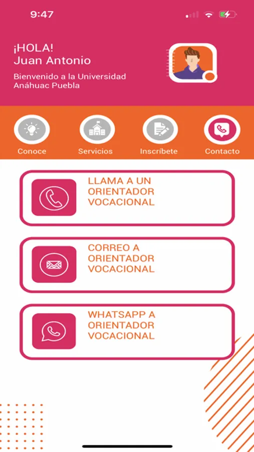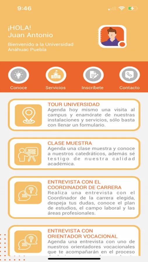 Así mismo, la aplicación tiene opción de contactar directamente al área de Orientación Vocacional de la Universidad Anáhuac Puebla para realizar estudios más profundos sobre vocación, generar entrevistas con Coordinadores de Carrera y de citas para realizar Tour por el campus.