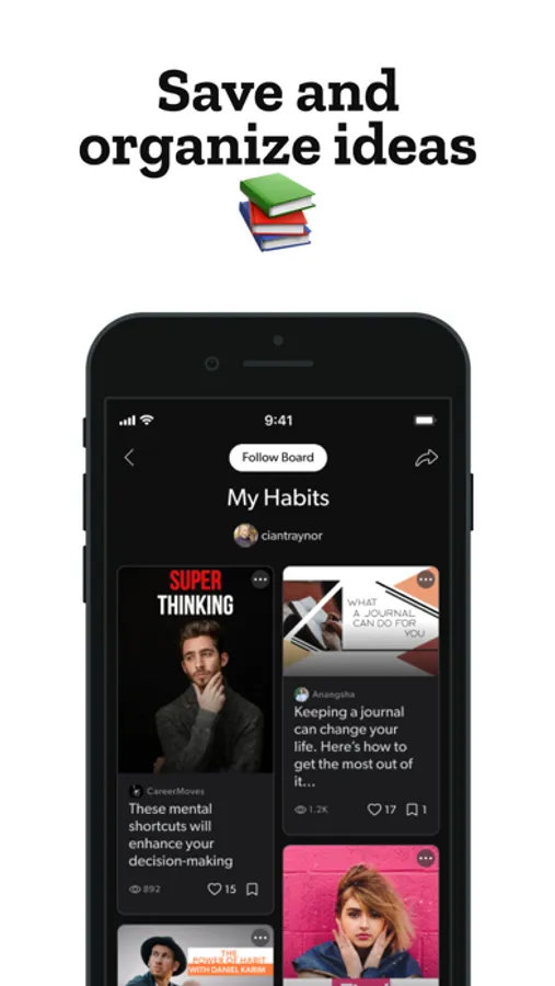Share knowledge by creating your own Memos – or curate personalized Collections of motivation and wisdom for others. See an inspiring idea you want to remember? Simply save it for later in your notes library.
