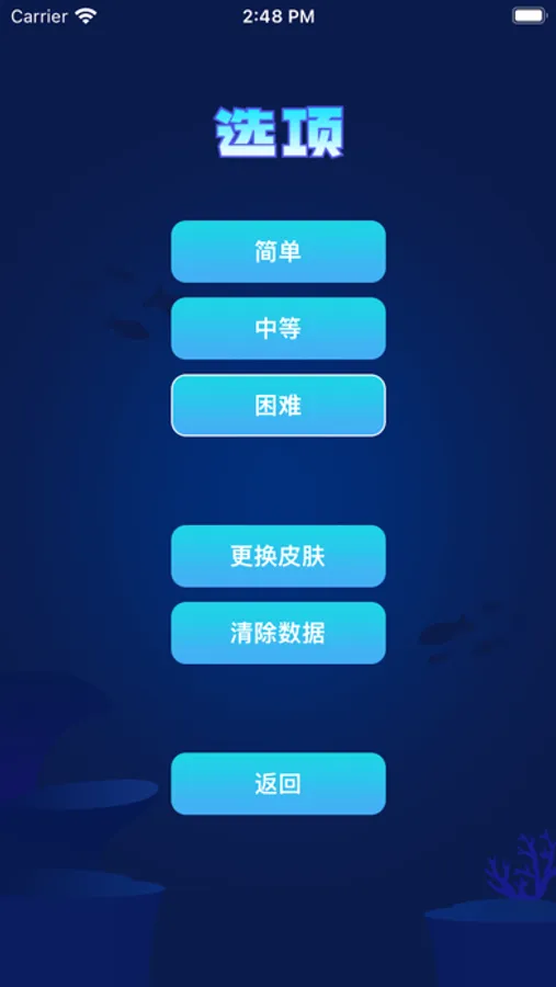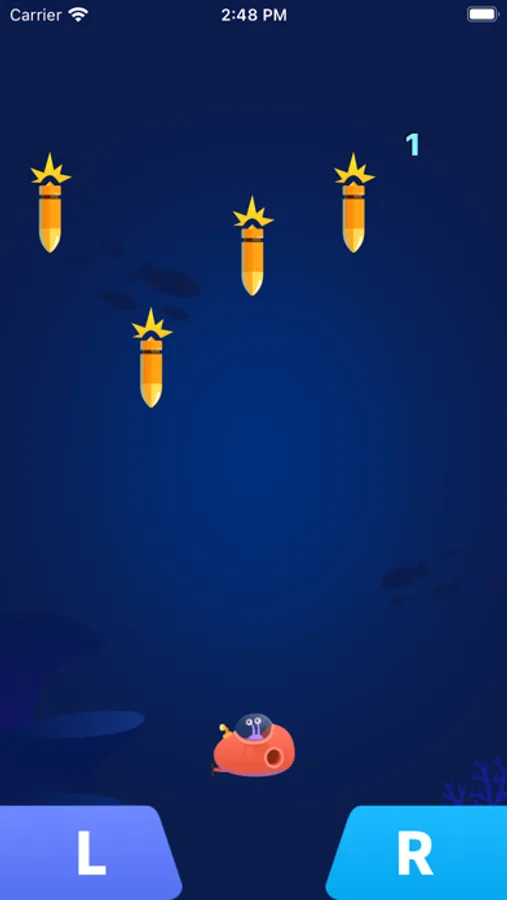 按 L 或 R 躲避导弹来袭。有简单、中等、困难三种方式可选择。角色有三种,分别是乌贼王、鲤鱼王、深海巨鲨。分别统计了最低最高分、中等最高分、困难最高分、共躲避了多少个火箭等。通过此款游戏使用户达到放松的效果