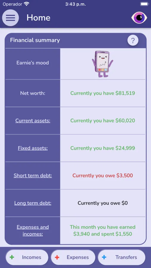 You can check your financial status at a glance using the financial summary widget at the top of the home screen. Earnie will change its mood according to your financial habits.