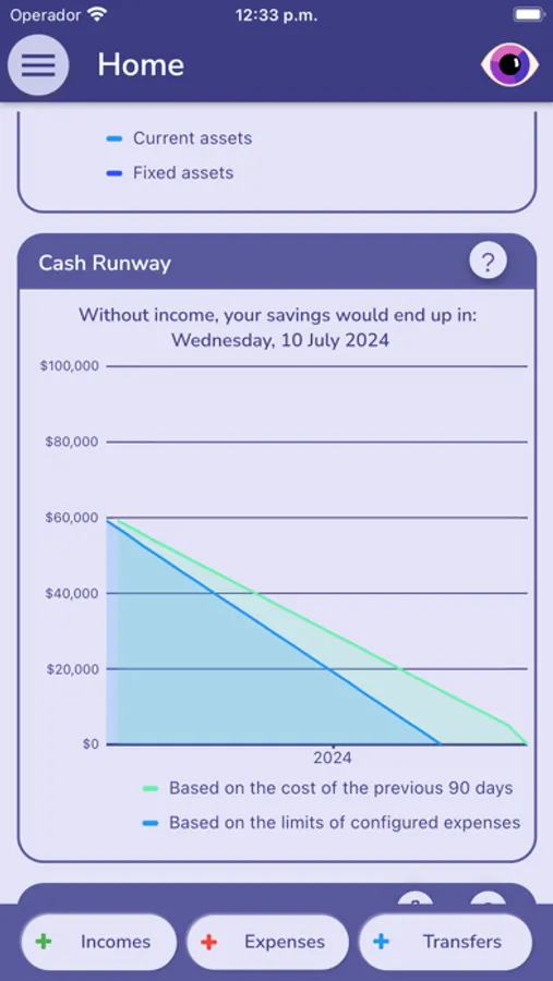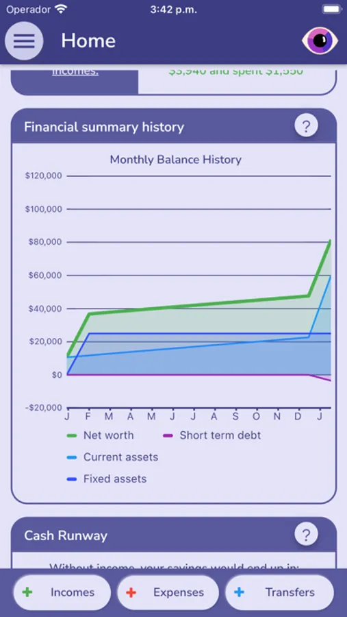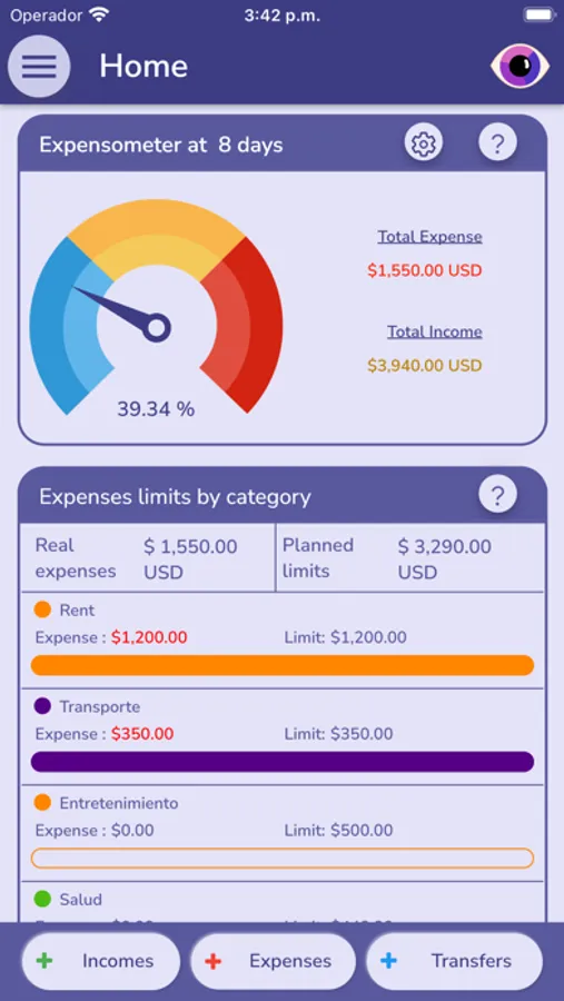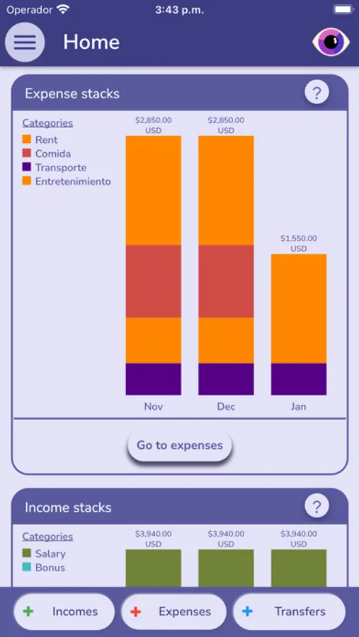 As you register information, the widgets in the home screen will let you see the outcome of your financial behavior of the current and last two months, grouped by categories.