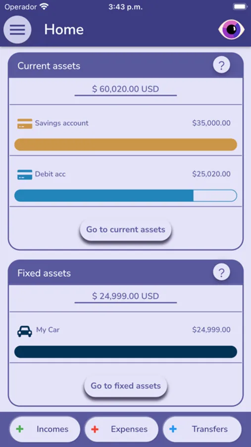 You can see them in comparison one to another in the home widgets. In our app you can manually register any bank account, any asset, and any liability using several currencies. When you add them up altogether you get what is called your net worth.