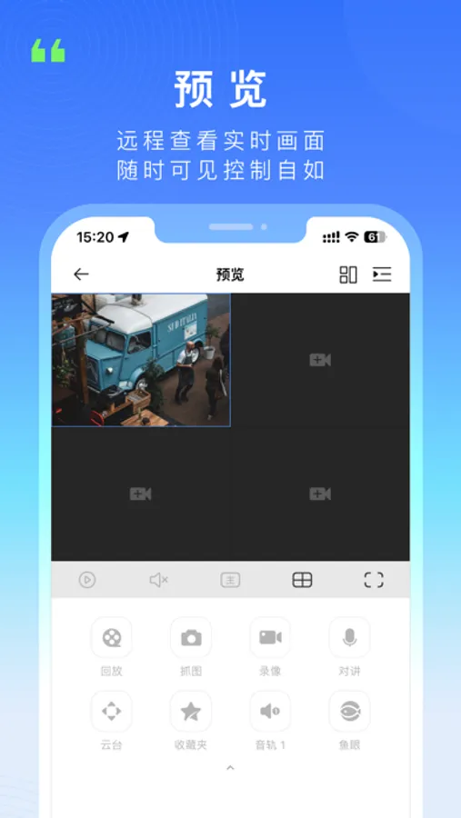 1、支持对前端摄像机、硬盘录像机、网络球机等设备的实时图像预览、录像回放与云台控制等功能。