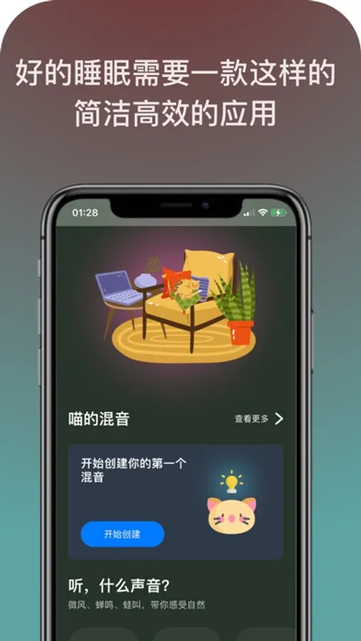 喵睡眠,一款帮助睡眠,提高专注力,减轻负担放松心灵的助眠应用。
