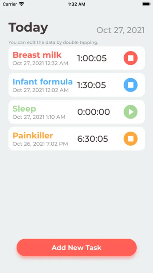 To use the app, tap the "Add new task" button, set the name and color, and you're ready to go. Tap the play button to start measurement. It is a simple structure that the measurement is completed when the stop button is pressed.