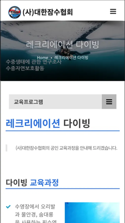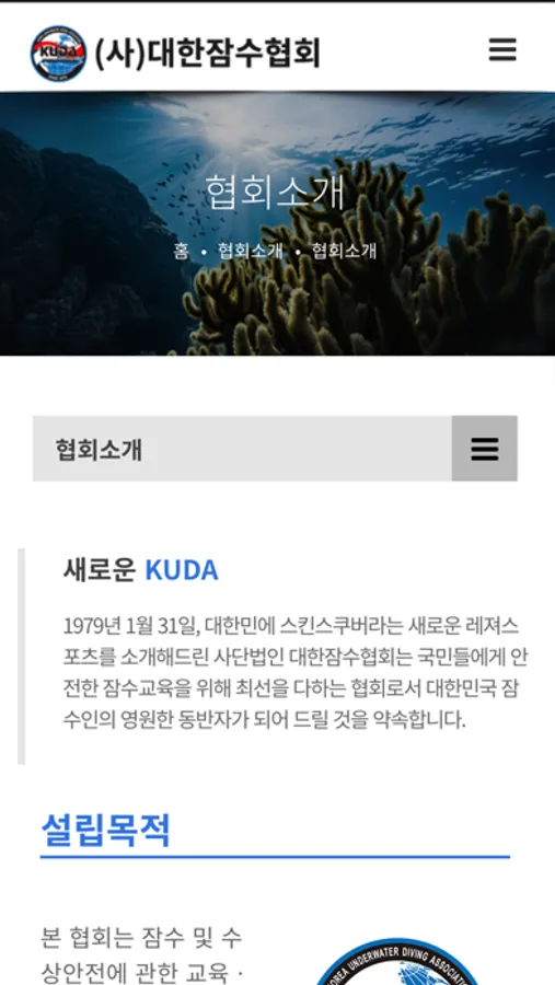(사)대한잠수협회는 1979년 1월 31일, 대한민에 스킨스쿠버라는 새로운 레져스포츠를 소개하여 국민들에게 안전한 잠수교육을 위해 최선을 다하는 협회로서 대한민국 잠수인의 영원한 동반자가 되어 드릴 것을 약속합니다.