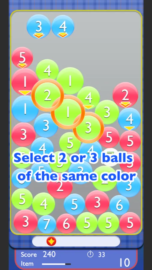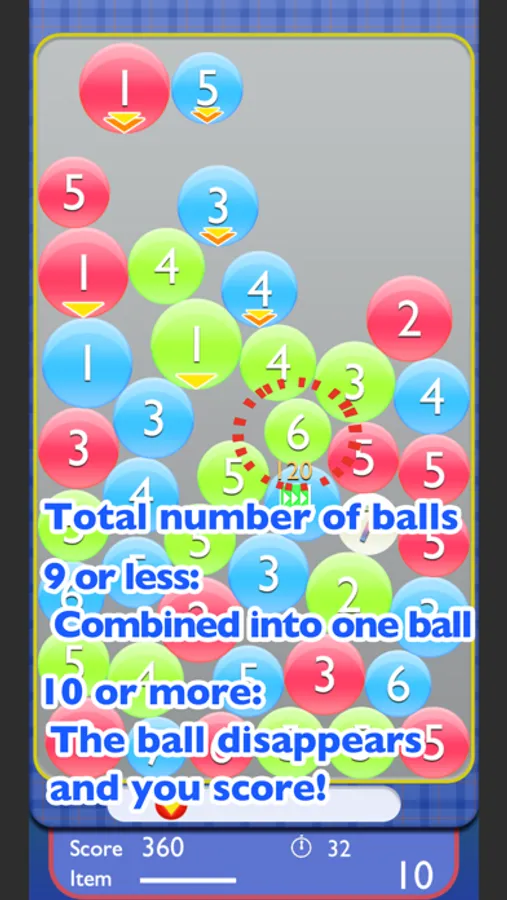 When the selected balls number is 10 or more, the ball disappears and you score!