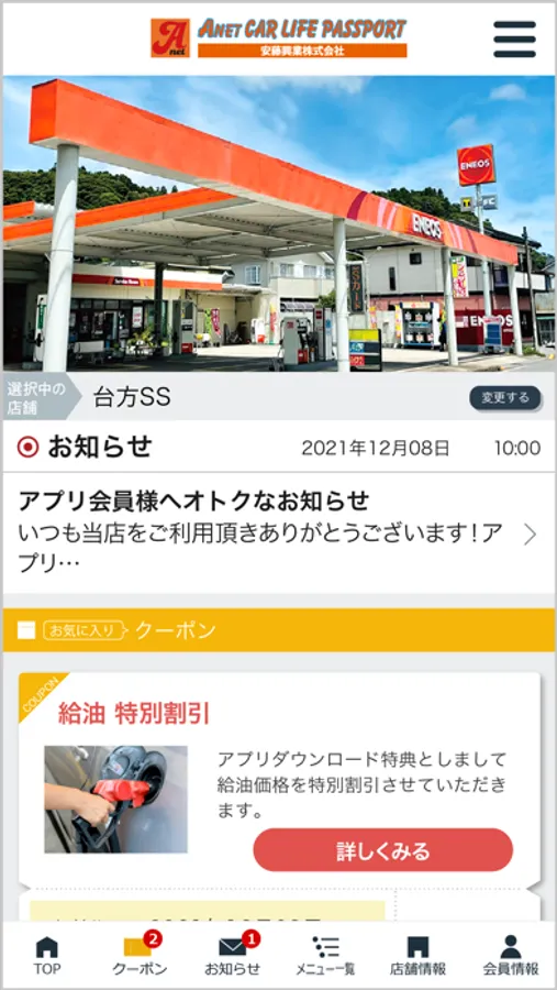 「Anet-安藤興業」のダウンロード・ご利用は無料です。アプリダウンロード後にご希望の店舗をご登録の上、ご利用ください。