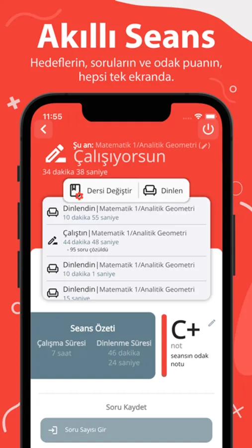 Çalışma seansı ile çalışma süreni anlık olarak uygulamada takip et. Mola verdiğinde uygulamadan tek dokunuşla durumunu güncelle ve uygulama senin için her şeyi yapsın. Endişe etme! Eğer molayı bırakıp derse geçmişsen veya durumunu güncellemeyi unuttuysan seansı geri sarma özelliği emrinde. Seansı bir saate kadar geri sarabilir hatta belirli bir vakte kadar olan durumunun aslında ne olduğunu güncelleyebilirsin.