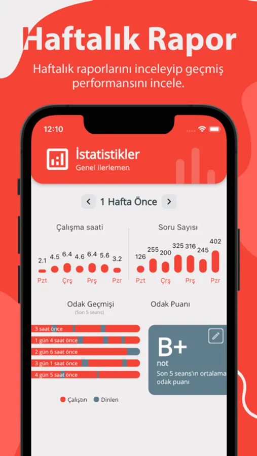 İstatistiklerini ana ekranda parmağını sağa kaydırarak görebilirsin. Son 7 günkü ders çalışma süreni, çözdüğün soru sayısını günlük olarak görebileceğin arayüzde görmek istemediğin istatistiklerin grafiklerini kapatabilirsin.