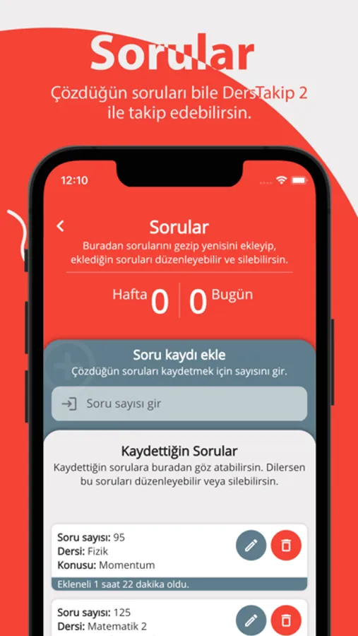 Soru takibi özelliği olarak çözdüğün soruları kaydeder. Tek yapman gereken aktif bir seansta iken seans kapatma düğmesini sola sürükleyerek çözdüğün soru sayısını eklemek. Tabii ki senin derslerinden oluşan listeden seçtiğin derse. Derslerini ana ekrandan erişebileceğin derslerin bölümünden ekleyebilirsin
