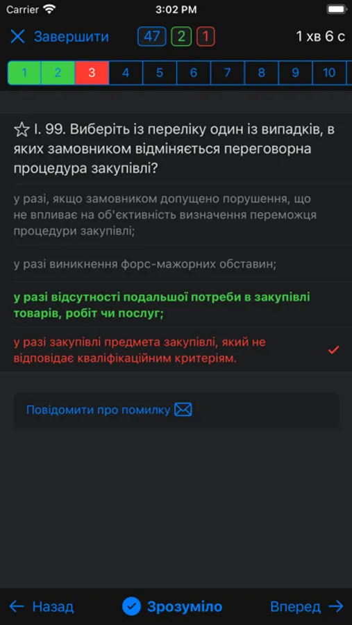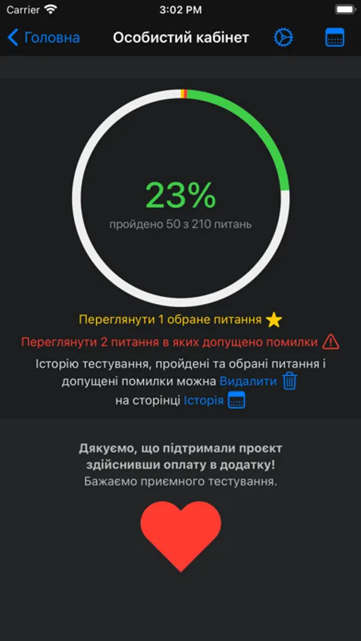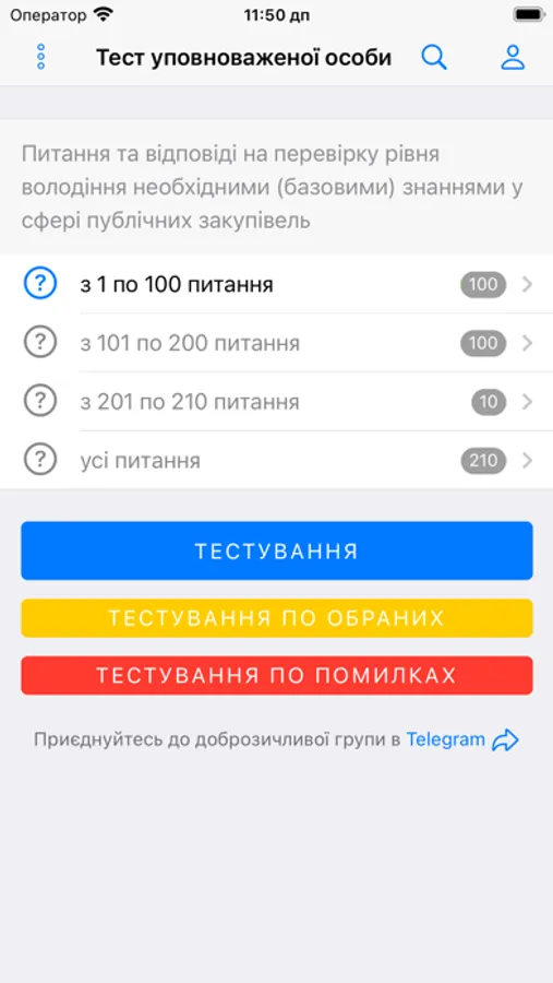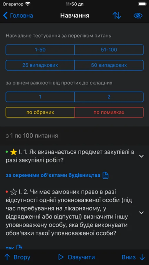 - Тестування по питанняx будь-яких вибраних розділів: підряд, випадково або за важкістю (визначається за статистикою проходження тестів усіма користувачами додатку);
