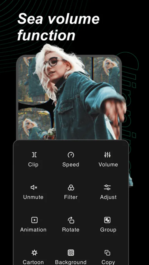 Support split, speed adjustment, animation, mask, background, volume/mute, filter, special effect, color adjustment, replacement, copy, rotate, delete, crop, cutout, video-reverse