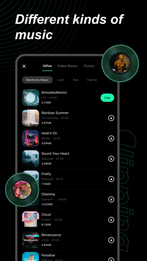 Three music sources are supported: hi-five music library, extract audio from video, and iTunes music library.