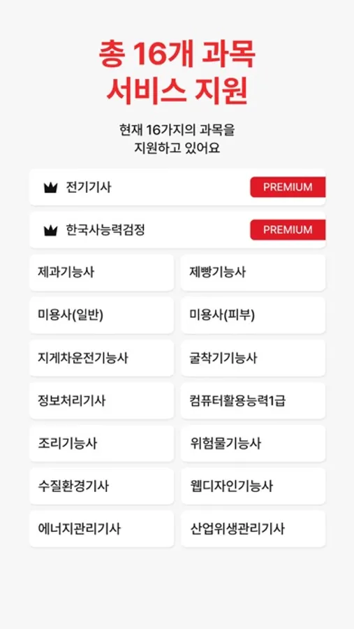 전기기사, 한능검(심화), 조리기능사(한식, 양식, 일식, 중식, 복어), 제과 기능사, 제빵 기능사, 미용사(일반), 미용사(피부), 지게차운전기능사, 굴착기기능사, 정보처리기사, 컴퓨터활용능력 1급 위험물기능사, 수질환경기사, 웹디자인기능사, 에너지관리기사, 산업위생안전기사 합격은 맞추다.