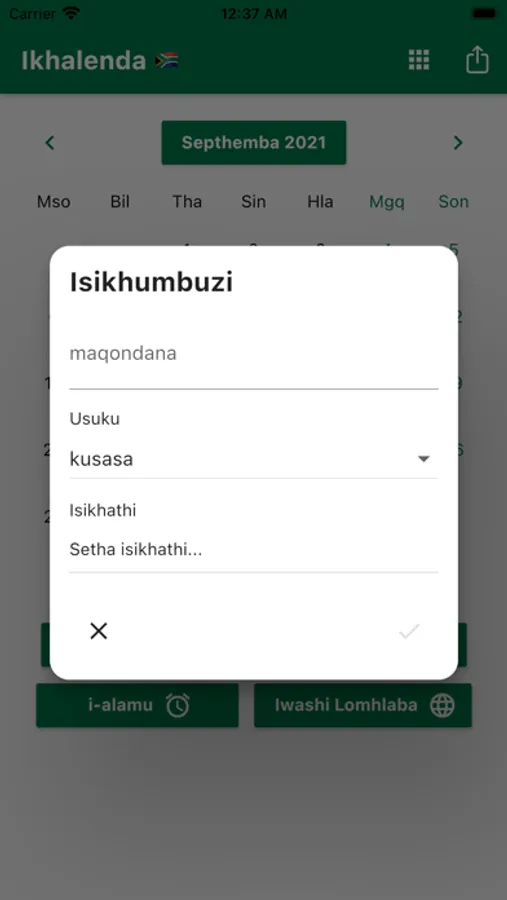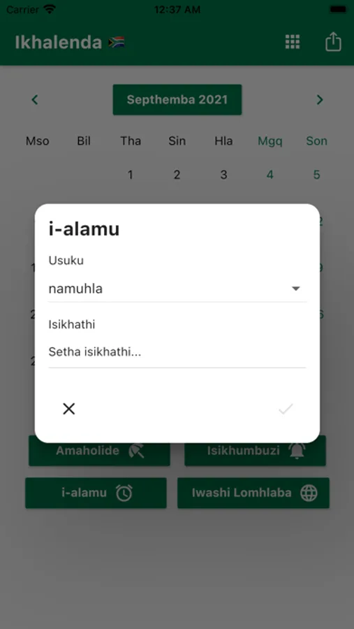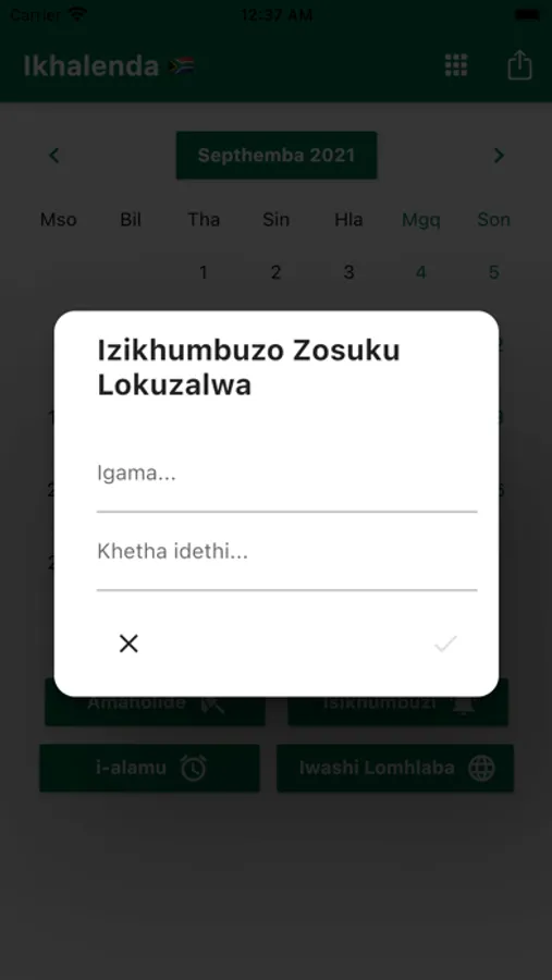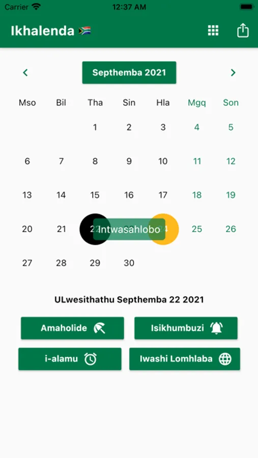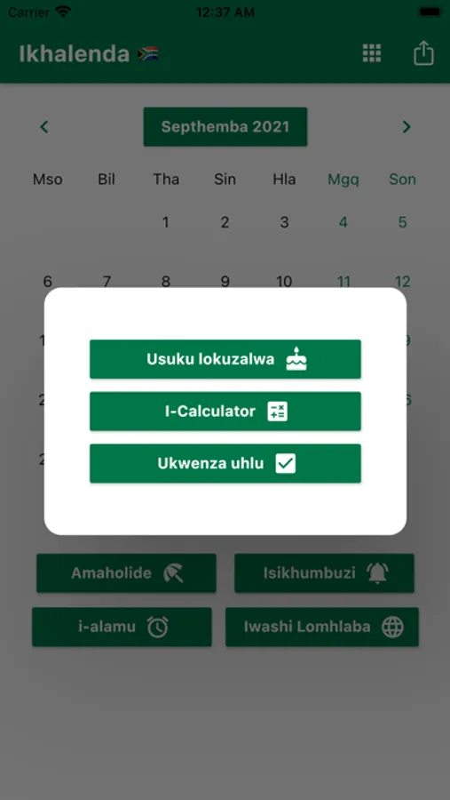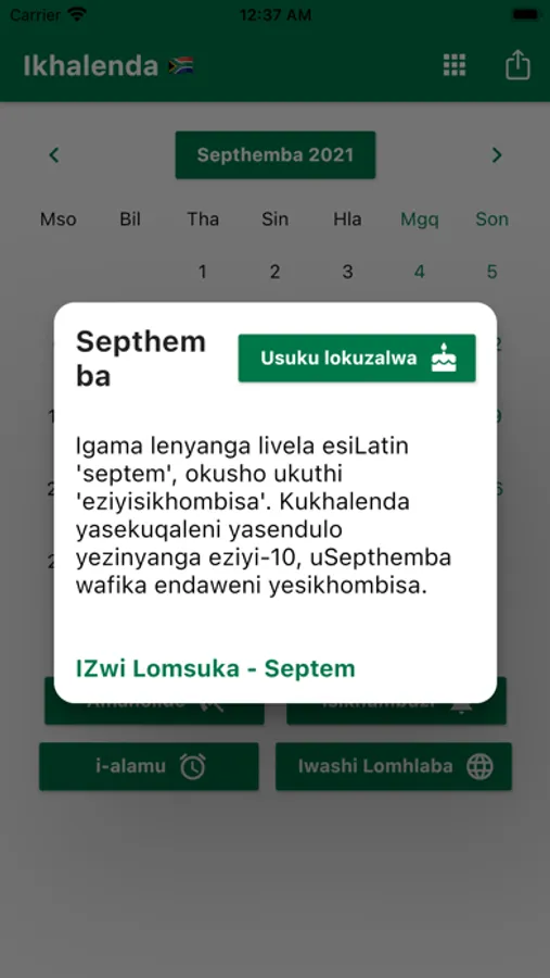 Ungasetha izikhumbuzi bese waziswe ngesikhathi esifanele. Siqinisekisa ukukukhumbuza ngamaholide INingizimu Afrika Iholide. Ungabhalisa izinsuku zokuzalwa zabangani bakho nemindeni yakho ukuze waziswe kusengaphambili. Izinsiza ezilula ezifana ne-Calculator, i-World Clock ne-i-alamu zifakiwe. I-World Clock ikhombisa isikhathi emadolobheni ahlukene emhlabeni jikelele. Ikhalenda lethu lifaka Uhlu Lokwenza Okusemlandweni Womsuka Wenyanga ngayinye. Isikhathi Sendawo saseNingizimu Afrika. Umhumushi.