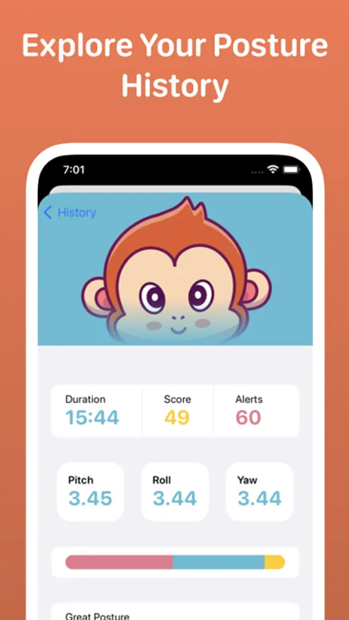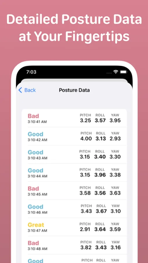 - View detailed information about your posture sessions, including average pitch, roll and yaw