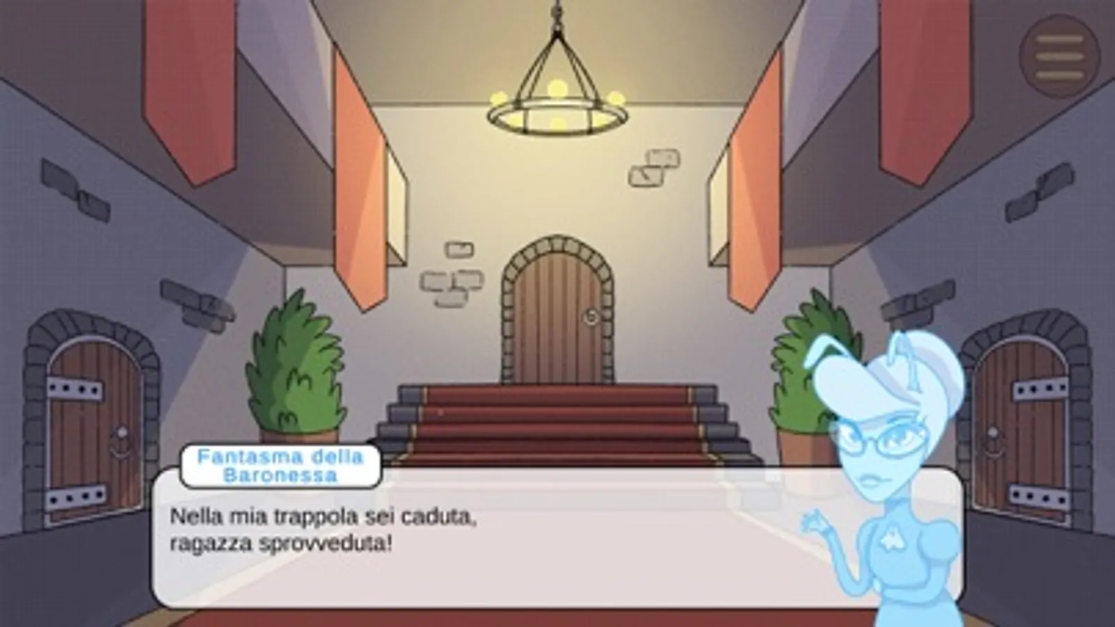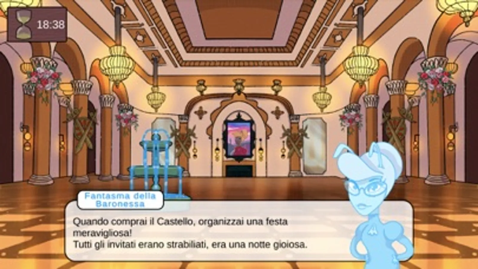 Il Castello ha tre stanze (cucina, biblioteca e salone delle feste) e un atrio. In ciascuna stanza il Fantasma della Baronessa ti metterà alla prova con rompicapi da risolvere.