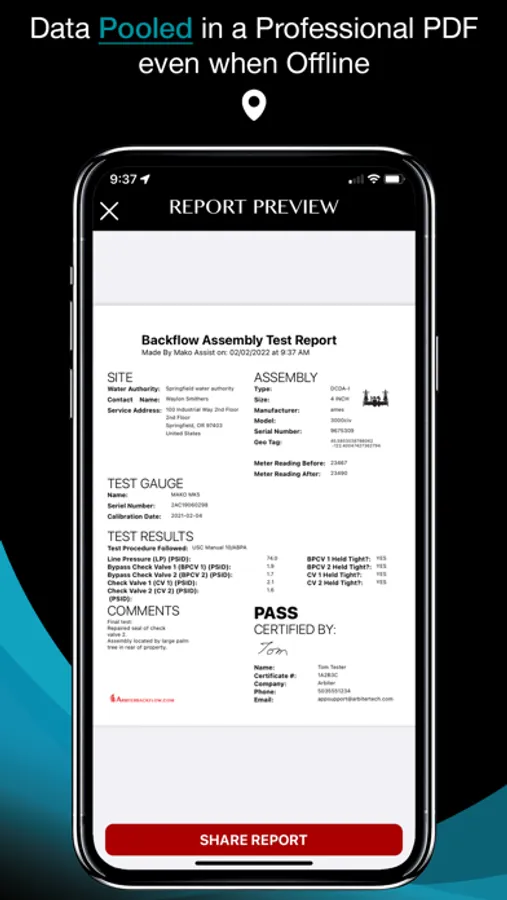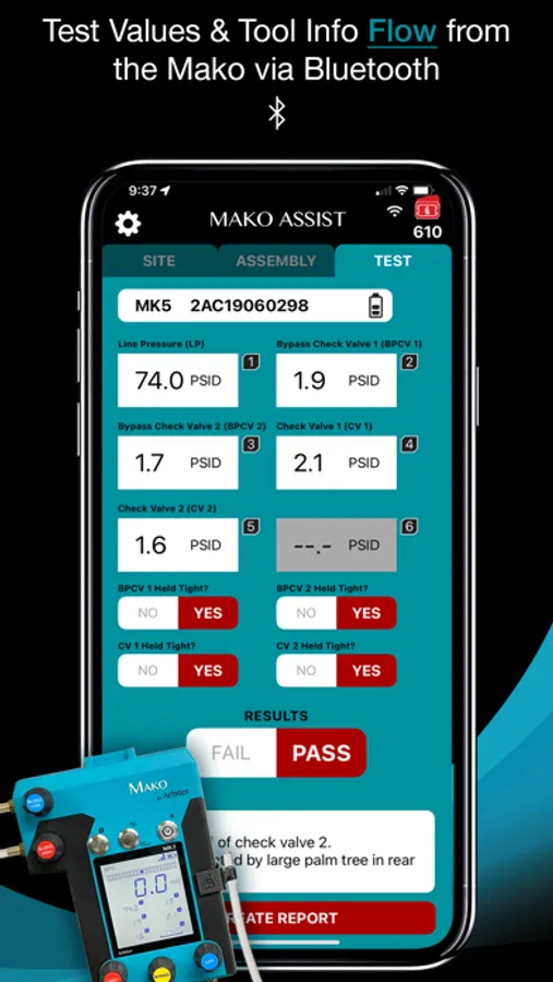The Mako Assist app allows backflow testers to ditch the notepad! Through the power of Bluetooth technology (included in every Mako) Backflow test values are automatically sent to your phone where they are labeled and prepared for reporting. Mako Assist allows testers to easily input essential information to generate a professional report with or without an internet connection! Look forward to Testing!
