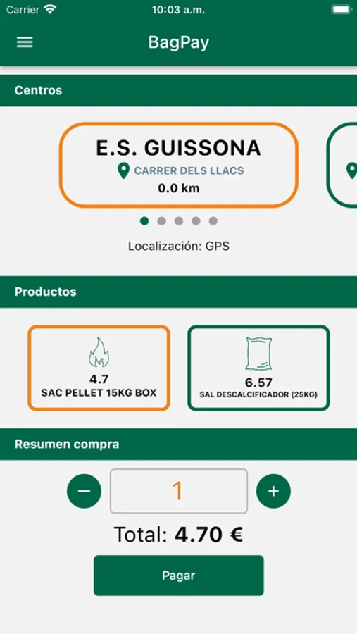 La primera vez que se abra la aplicación será necesario que se registre para poder identificarle y realizar pedidos. Una vez dentro, por defecto se intentará localizar el centro más próximo a vuestra ubicación(aunque podrá realizar pedidos en otros centros remotamente). Solo debe seleccionar el producto y la cantidad para realizar el pedido.