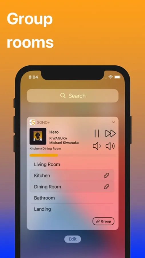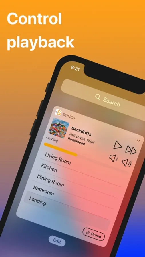 Choose any room in your home and control volume, play/pause or skip tracks.